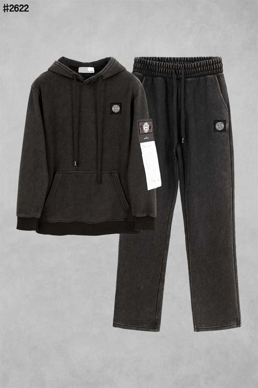 [STONE ISLAND] 스톤아일랜드 블랙 와펜 가먼트다잉 테리 후드 티셔츠 & 가먼트다잉 테리 팬츠 셋