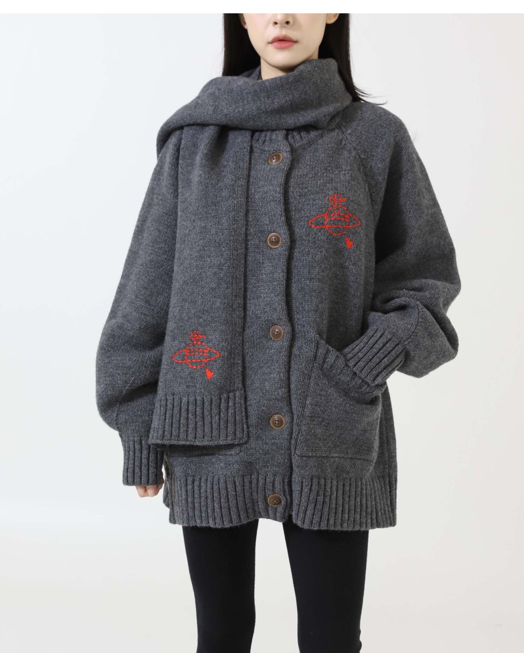 비비안웨스트우드 [ Vivi*nne Westwood ] 수입 새턴 자수 가디건 + 머플러 SET -챠콜-