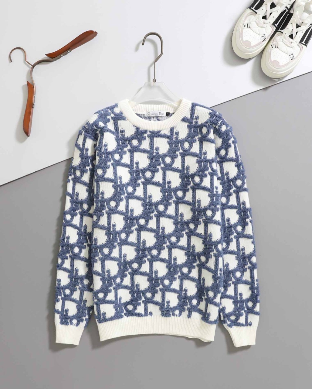 디올 [ D*OR ] 수입 화이트 및 블루 버진 울 자카드 오블리크 스웨터