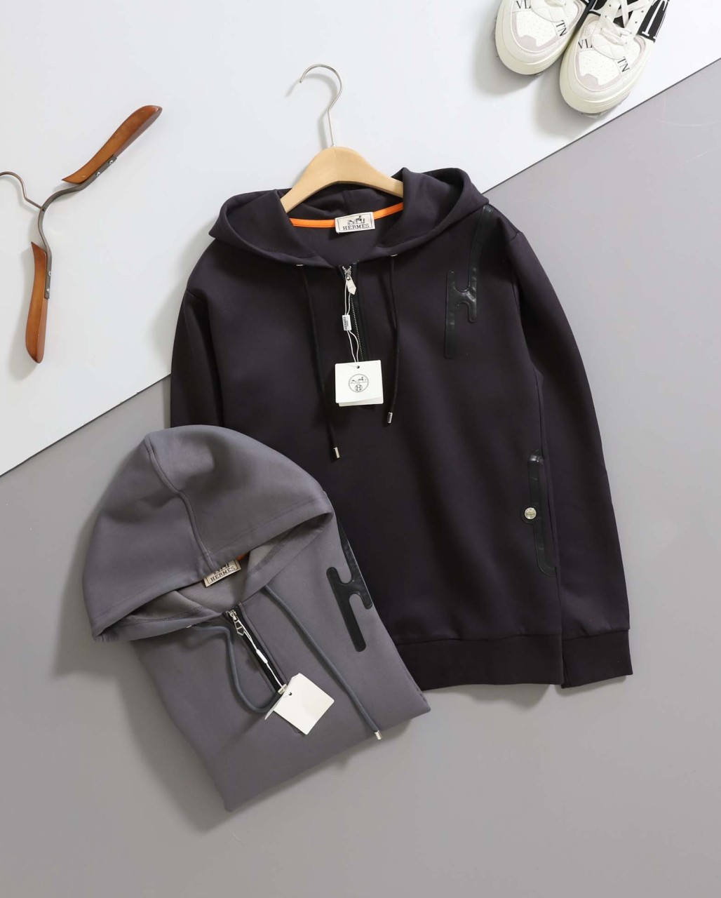 에르메스 [ HRMS ] 수입 H 레더 로고 반집업 후드 티셔츠