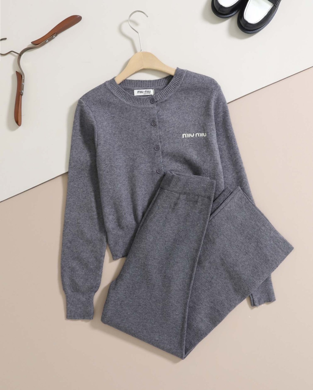 미우미우 [ miu ] 수입 스몰 레터링 라운드넥 가디건 & 니트 와이드 팬츠 set