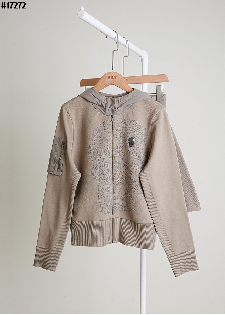 [AMAZING CRE] 어메이징크리 에어로핏 라인 알렉스 자카드 니트 풀집업 후드 자켓 & 에어로핏 니트 플레어 스커트 셋